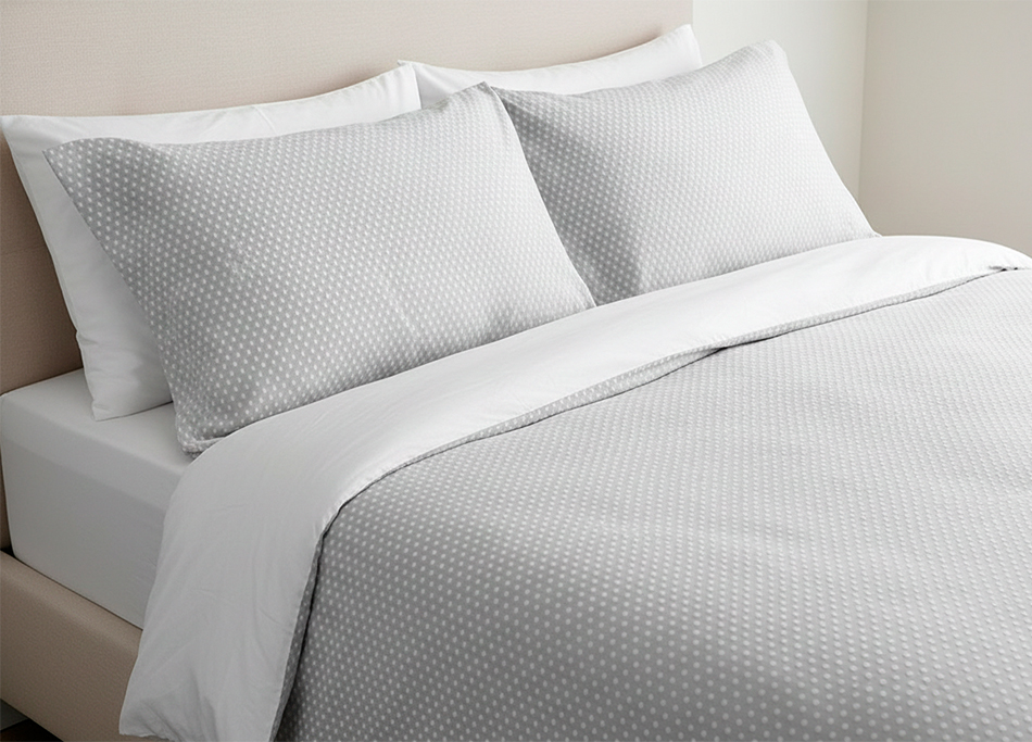 The classic grey color paired with white dots enhances your bedroom décor with an air of refinement. The back of the duvet cover features a 200 thread count Egyptian cotton, ensuring both durability and softness.